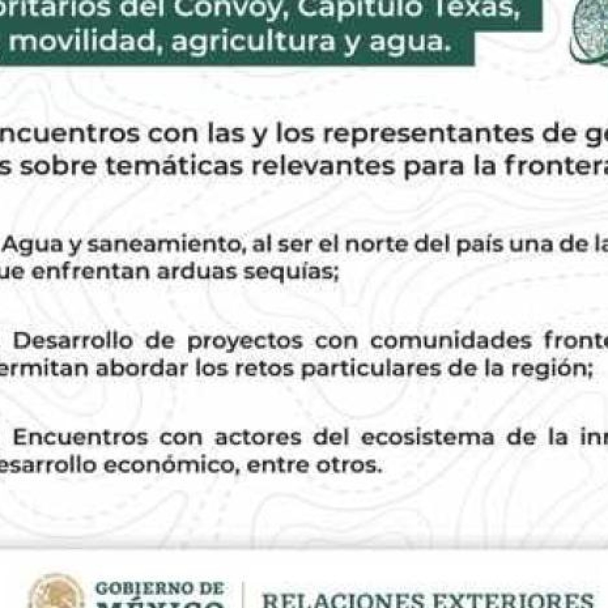 La agenda, que se desarrollará a partir de este lunes 17 y hasta el próximo viernes 21 de la semana que inicia, fue generada a partir de la identificación de necesidades y potencial de cada uno de los municipios y estados representados, y priorizará temáticas que se consideran relevantes para los municipios de la frontera norte del país, como: I) agua y saneamiento, al ser el norte del país una de las regiones que han enfrentado arduas sequias en los últimos meses, e incluso años; II) desarrollo de proyectos con comunidades fronterizas, que les permitan abordar los retos particulares de la región; III) encuentros con actores del ecosistema de Texas para la innovación y desarrollo económico, entre otros.