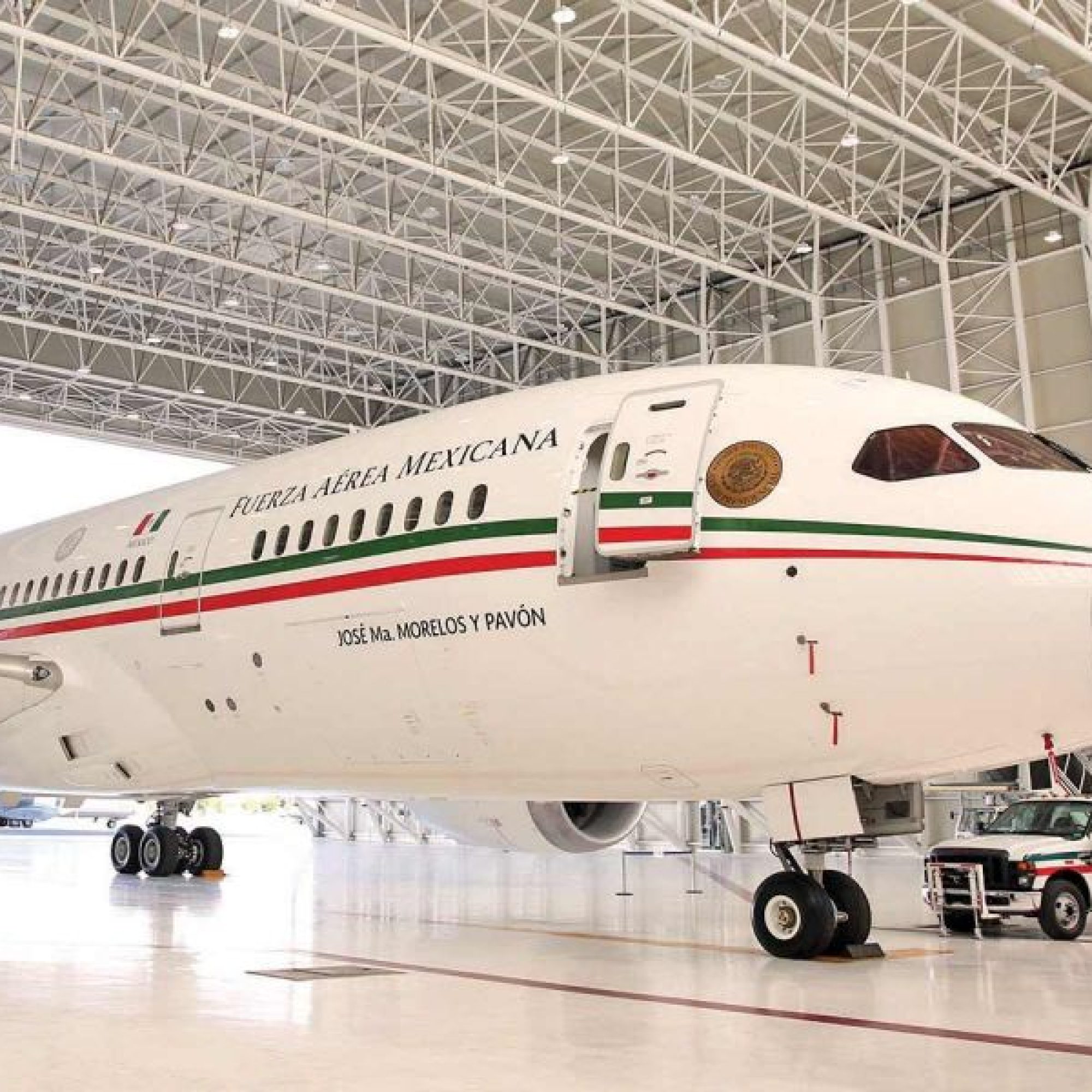 En el álbum fotográfico que acompaña la promoción se observa la aeronave ya sin los escudos de “Poder Ejecutivo’’. “Avión Presidencial” y del Estado Mayor Presidencial; ni las letras de “Fuerza Aérea Mexicana”, José María Morelos y Pavón y la bandera de México. Sólo conserva la franja tricolor.