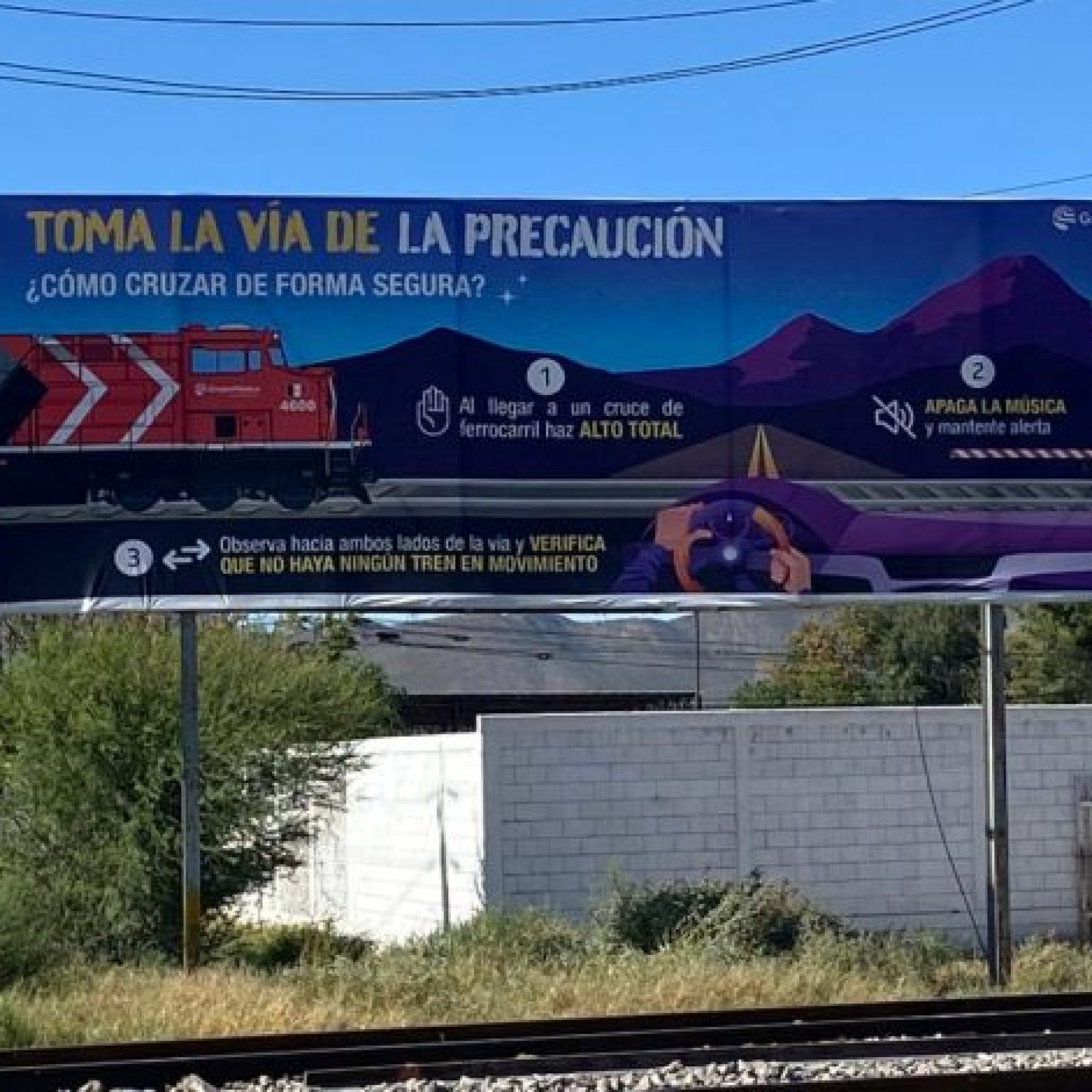 El espectacular, colocado por Grupo México, proporciona información a los conductores sobre cómo cruzar de manera segura las vías para evitar un accidente con el tren.