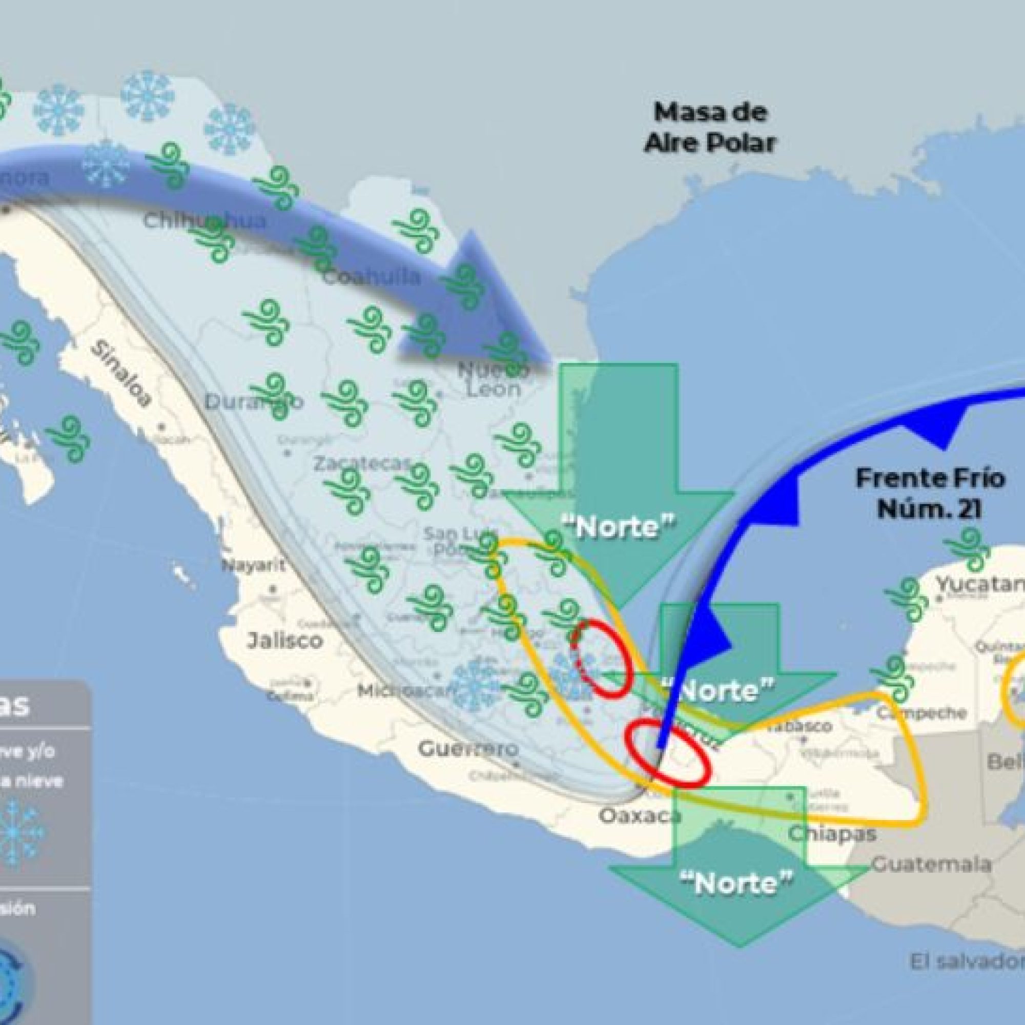 Las predicciones meteorológicas del clima también informan que existirán condiciones para la posible caída de aguanieve o nieve en en las sierras de Sonora y Chihuahua, así como en cimas montañas del centro y oriente de México, es decir, en el Edomex, Tlaxcala, Puebla y Veracruz.