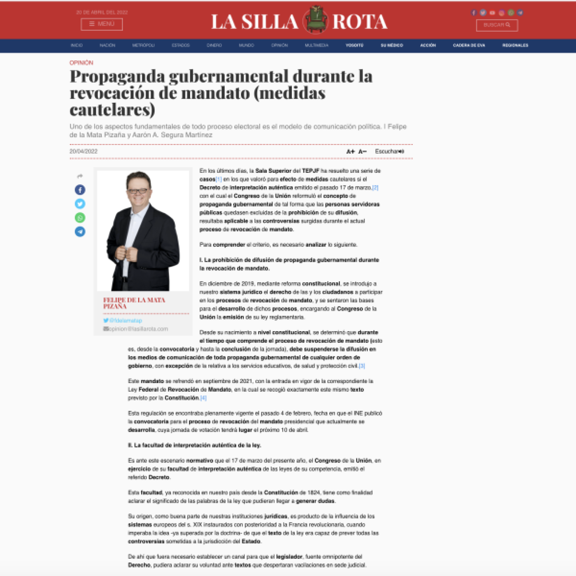 La Sala Especializada del Tribunal Electoral del Poder Judicial de la Federación (TEPJF) determinó la existencia de las infracciones consistentes en difusión de propaganda gubernamental en periodo prohibido y violación al proceso de revocación de mandato, atribuidas a diversas personas del servicio público, derivado de las publicaciones realizadas en sus cuentas de Facebook, Twitter e Instagram.