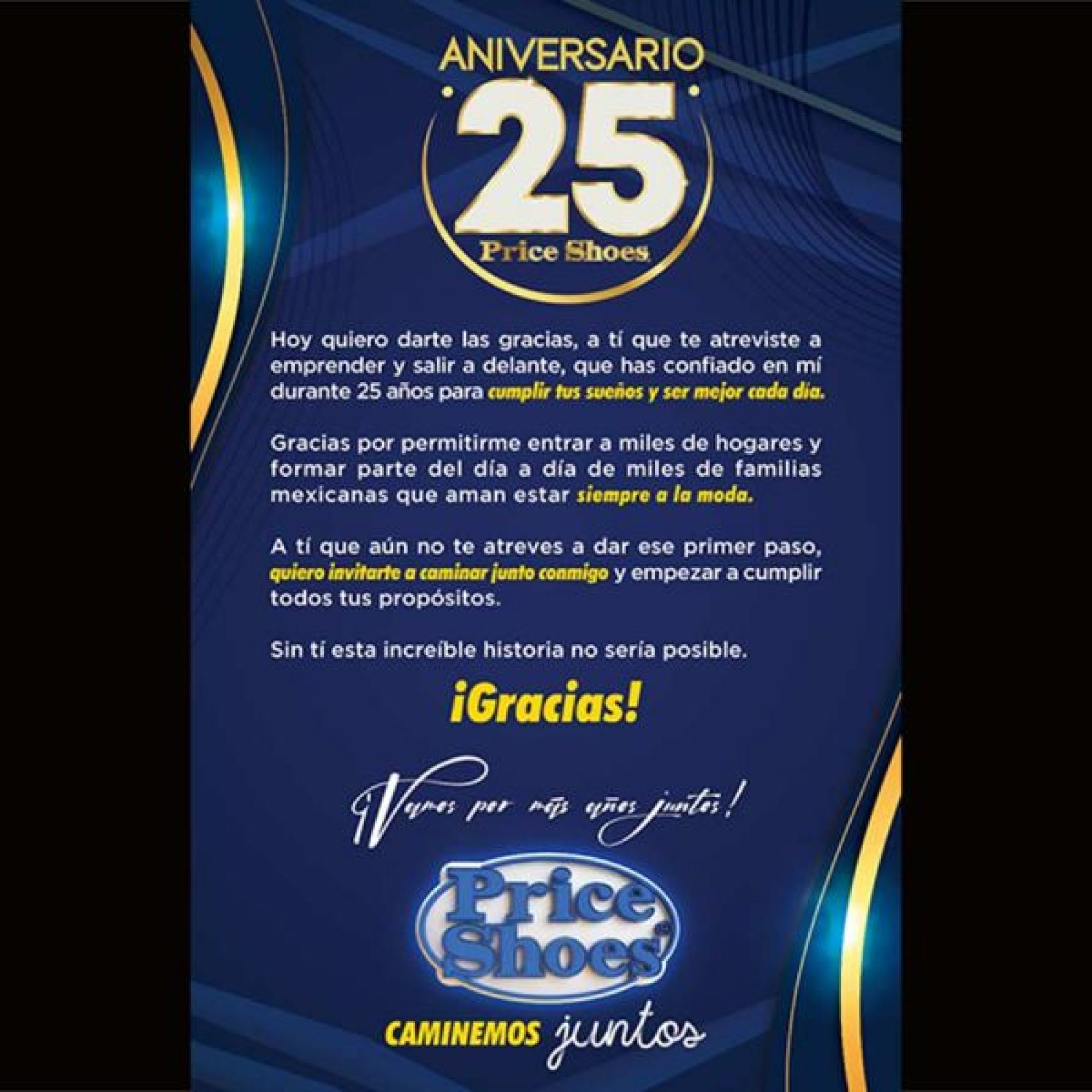 A propósito de su 25 aniversario, Price Shoes, la empresa de moda en zapatos, ropa y joyas, agradece a cada uno de sus afiliados por confiar en ella para emprender, autoemplearse, cumplir sus sueños y ser cada día mejor.